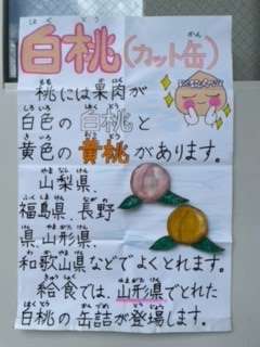 今日の白桃(カット缶)は、山形県産の白桃を約2cm角にカットし、缶詰にしたものです。小さくカットされているので、子どもたちも食べやすかったようです。