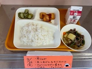 9月26日(月)、今日の給食は「肉じゃが・あつあげのみそだれかけ・きゅうりのゆずの香あえ・ごはん・牛乳」です。