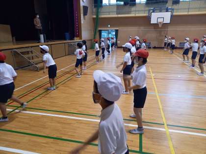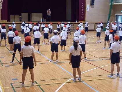 4年生は今日、運動場で練習予定でしたが、雨のため体育館で練習を行いました。