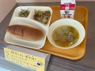 10月4日(火)、今日の給食は「豚肉のカレー風味焼き・はくさいのスープ・もやしとピーマンのいためもの・黒糖パン・牛乳」です。