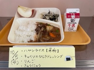 10月5日(水)、今日の給食は「ハヤシライス【米粉】・キャベツのひじきドレッシング・りんご・牛乳」です。
