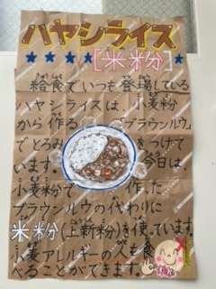 ハヤシライスは、ふだんは、小麦粉から手作りするルウでとろみをつけているのですが、今日のハヤシライス【米粉】は、米粉(上新粉)を水で溶いてとろみをつけています。小麦アレルギーのある児童も安心して食べることができます。油を使っていないので、ルウで仕上げるハヤシライスよりもあっさりとした味わいです。