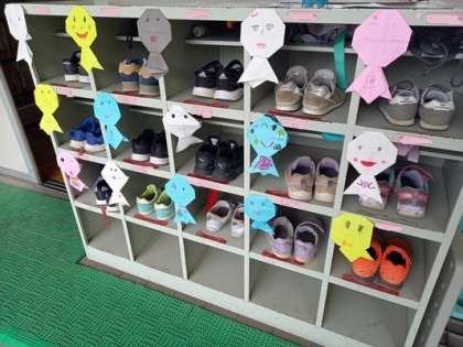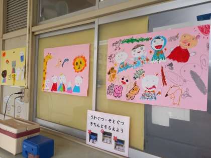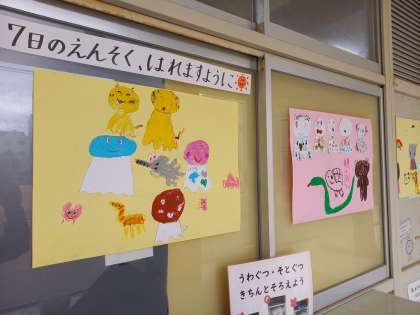 の願いを込めて、「てるてるぼうず」の絵が飾られています。