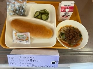 10月6日(木)、今日の給食は「タンタンめん・きゅうりの甘酢づけ・ミニフィッシュ・コッペパン・アプリコットジャム・牛乳」です。