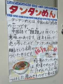 給食のタンタンめんは、にんじん、もやし、チンゲンサイなどが入った汁めんに、肉みそをかけていただきます。肉みその味付けには、テンメンジャンや赤みそを使っています。にんにくがきき、味にパンチがありました。めんは、棒めんです。