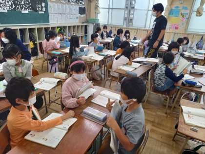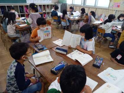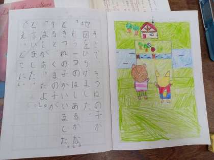 絵を見てお話を書こう(2年国語) (10月7日) 公開日 2022/10/07 更新日 2022/10/07 お知らせ 2年生の国語の学習に「絵を見てお話を書こう」という単元があります。4つの場面の絵と登場人物の言葉が教科書に載っていますが、3枚目の絵は「まっしろ」です。お話でいうところの「起承転結」の「転」の場面のお話を子どもたちが考えて書いていきます。 1人1人、とてもユニークなお話が書けていて、班ごとやクラス全体で発表会もしました。 小さな絵本作家さんがたくさん誕生しました! いいね(0)