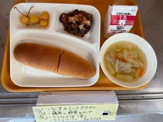 10月12日(水)、今日の給食は「なすのミートグラタン・鶏肉と野菜のスープ・さくらんぼ(缶)・黒糖パン・牛乳」です。