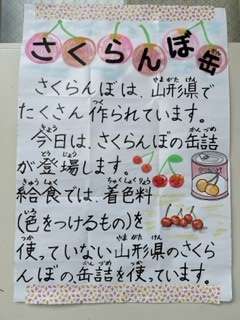 大阪市の給食では、甘味料、着色料、香料を含まないさくらんぼの缶詰を使っています。実が淡い黄色をした山形県産のさくらんぼです。