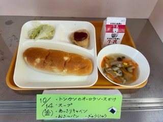 10月14日(金)、今日の給食は「トンカツのオーロラソースかけ・スープ・あっさりキャベツ・おさつパン・牛乳」です。