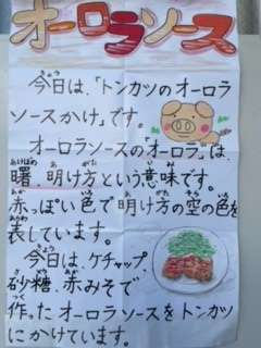 今日のもともとの献立は、「まぐろのオーロラ煮」でしたが、まぐろの調達が急遽困難になったため、「トンカツのオーロラソースかけ」に変更となりました。