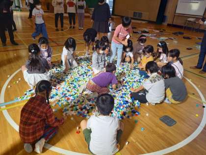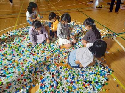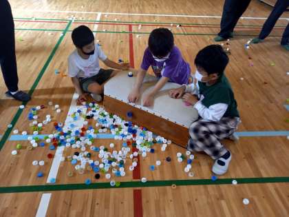 ペットボトルのキャップを使って、さまざまな遊びを考えていきます。