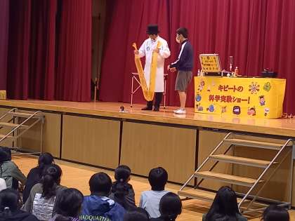 今日は文化庁の支援を受けた芸術鑑賞会の一環として、「キビート科学実験ショー」が波除小学校で行われました。