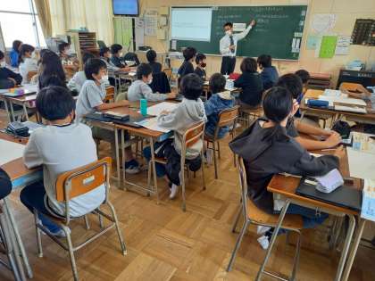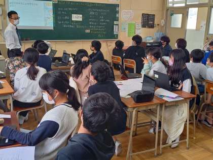 子どもたちは日ごろから各自の端末を上手に使いこなしており、今日の授業でも資料を閲覧したり、自分の意見や考えを端末に入力し、前のスクリーンでクラス全員の記述を映し出して考えを共有したりするなど、授業の中でICT機器をうまく活用しながら、意欲的に学習に取り組むことができていました。