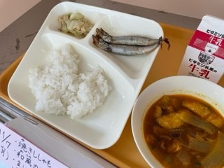 11月7日(月)、今日の給食は「焼きししゃも・和風カレー汁・まいたけとキャベツのいためもの・ごはん・牛乳」です。
