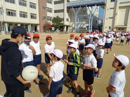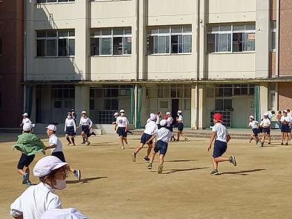 今日は3年生(1組・2組)と5年生(3組)が、異学年交流で体育の時間を使って「おにごっこ」と「ドッジボール」をしました。