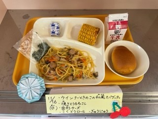 11月16日(水)、今日の給食は「ウインナーときのこの和風スパゲッティ・焼きとうもろこし・固形チーズ・黒糖ロールパン・牛乳」です。