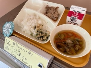 11月17日(木)、今日の給食は「豚肉のスタミナ焼き・すまし汁・とりなっ葉いため・ごはん・牛乳」です。