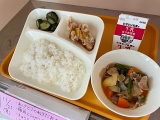 11月21日(月)、今日の給食は「あげどりのねぎだれかけ・豚肉とじゃがいもの煮もの・きゅうりの赤じそあえ・ごはん・牛乳」です。
