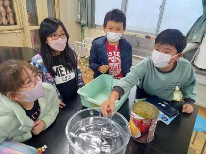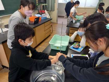 ものの温度と体積(4年理科) (11月29日) 公開日 2022/11/29 更新日 2022/11/29 お知らせ 4年生は理科の時間に「ものの温度と体積」の学習をしています。 この単元では「実験」を行って、実際にどのような反応が起こるかを調べていく学習も多くなります。 今日は、ガラス管の先に“ゼリー”をつけ、あたためたり、冷やしたりするとどのようになるかを調べてみました。 すると…、 “ゼリー”の思わぬ動きに、子どもたちからは歓声が! 実験の醍醐味ですね! いいね(0)