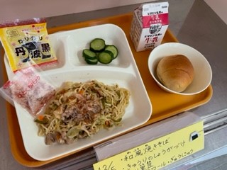 12月5日(月)、今日の給食は「和風焼きそば・きゅうりのしょうがづけ・いり黒豆・黒糖ロールパン・牛乳」です。