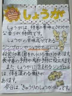きゅうりのしょうがづけは、しょうがを絞ったしょうが汁を使っています。しょうがは、世界中で使われている香味野菜のひとつです。しょうが特有の香り成分には、殺菌効果や風邪予防などのほかに、吐き気や頭痛を抑える、老化予防、脂肪の燃焼促進などの効用があります。また、体を温める働きがあるので、これからの季節にぜひ食べてほしい食材です。