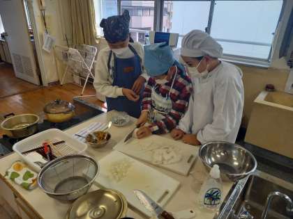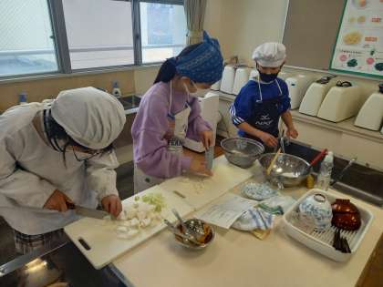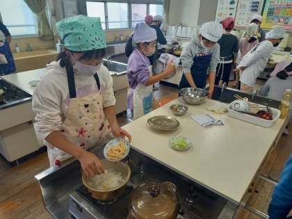 今日は5年2組と3組が調理実習に取り組みました。