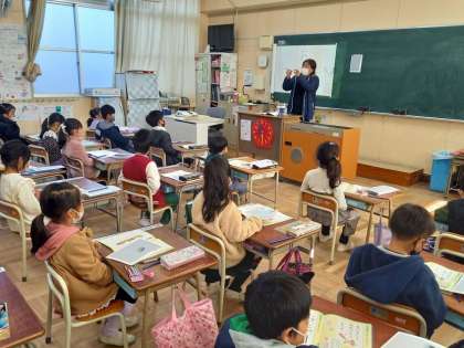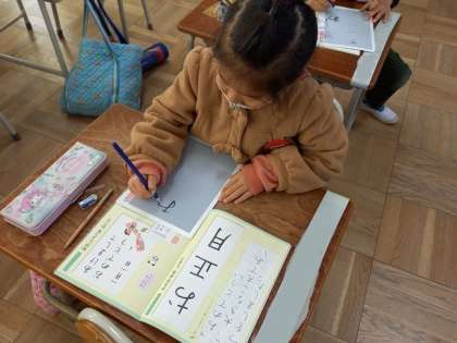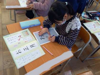 1年生の「書写」の学習に、“水書用筆”を使用し運筆について学ぶ時間があります。