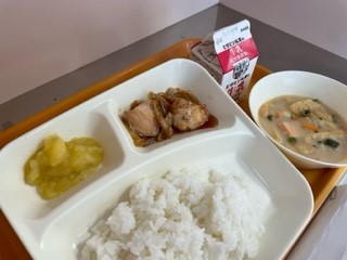 1月12日(木)、今日の給食は「鶏肉の甘辛焼き・かす汁・くりきんとん・ごはん・牛乳」です。