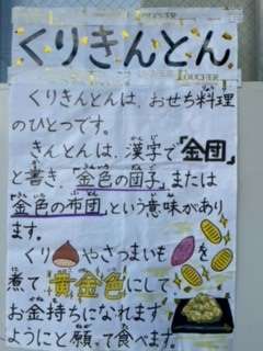 給食では、さつまいもとくり(水煮缶)を煮て、砂糖、みりん、塩で味付けして煮含めています。つやのある美しい黄金色に仕上がりました。甘い味つけで子どもたちにとても好評でした。