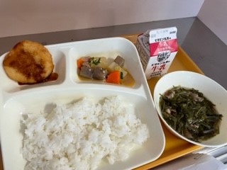 1月17日(火)、今日の給食は「鶏肉の土手焼き風・はりはり汁・れんこんのフライ大阪ソース味・ごはん・牛乳」です。