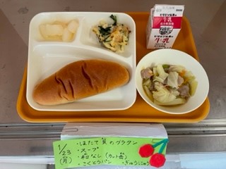 1月23日(月)、今日の給食は「ほたて貝のグラタン・スープ・和なし(カット缶)・黒糖パン・牛乳」です。