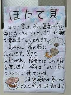 今日のほたて貝のグラタンは、ほたて貝柱を主材にツイストマカロニやたまねぎ、ほうれん草が入ったホワイトグラタンです。ほたて貝は、冬の貝の代表的なものでしたが、現在では、ほとんどが養殖ものだそうです。貝柱は、貝殻を閉じるときに使われる筋肉の部分です。うま味成分が多く、甘味もあります。生食、フライ、バター焼きなどにしてもおいしいです。