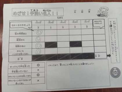 手洗い週間(1月24日) 公開日 2023/01/24 更新日 2023/01/24 お知らせ 今週は「手洗い週間」ということで、20分休憩や昼休みの時間に“手洗い”の音楽が流れ、子どもたちに“手洗い”の励行を呼びかけています。 保健委員会がつくった動画を参考に、遊んだ後や給食前など、子どもたちはていねいに手洗いをして、チェックカードに記入をしています。 いいね(0)