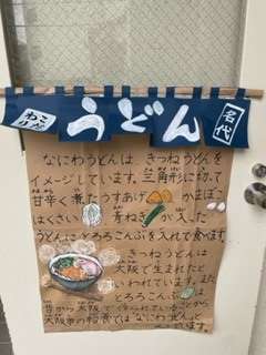 「なにわうどん」は、大阪が発祥とされる「きつねうどん」をイメージしています。うすあげは、三角形に切り、だし汁と砂糖、しょうゆ、みりんなどで甘辛く煮て、最後にうどんと合わせています。大阪伝統的な食品であるとろろこんぶ(1人1袋)をかけていただきました。