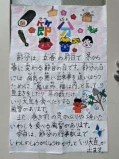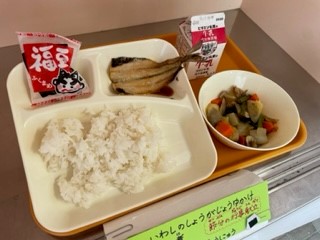 2月3日(金)、今日は節分の行事献立で「いわしのしょうがじょうゆかけ・含め煮・いり大豆・ごはん・牛乳」です。