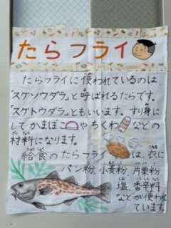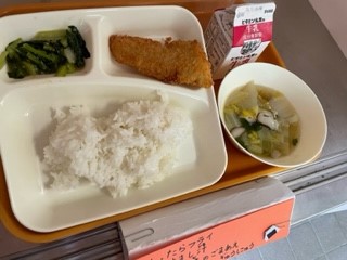 2月6日(月)、今日の給食は「たらフライ・すまし汁・こまつなのごまあえ・ごはん・牛乳」です。