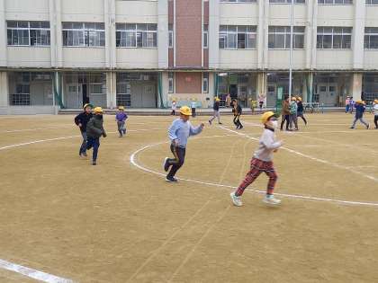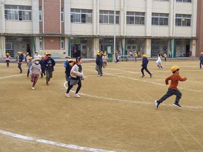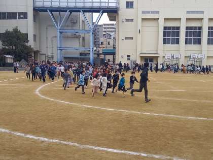 かけ足を通して、体を動かすことの心地よさを体感し、持久力をつけることを目標とし、来週17日金曜日までの2週間、子どもたちは学年別に分かれて20分休憩にかけ足運動に取り組みます。