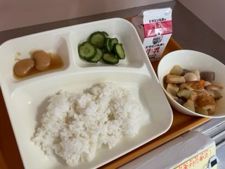 2月8日(水)、今日の給食は「関東煮・きゅうりの梅風味・白花豆の煮もの・ごはん・牛乳」です。