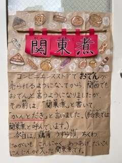関西では、「おでん」というと、「田楽(でんがく)」のことを指しました(でんがく→おでんがく→おでん)。関東から伝わったしょうゆ味の関東風の煮物は「関東煮(かんとだき)」と呼んで区別していました。(給食では、関東煮を「煮」の読み方どおり「かんとうに」と呼んでいます。)