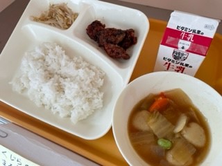 2月10日(金)、今日の給食は「くじらのオーロラ煮・まる天と野菜のうま煮・もやしのピリ辛あえ・ごはん・牛乳」です。