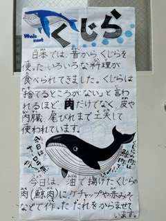 「先生、くじらがおいしすぎてさ、ハハハハハ…くじらがおいしすぎて、びっくり!!したよ。おかわりもしたよ。」