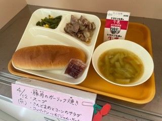 4月12日(水)、今日の給食は「豚肉のガーリック焼き・スープ・三度豆とコーンのサラダ・コッペパン・いちごジャム・牛乳」です。