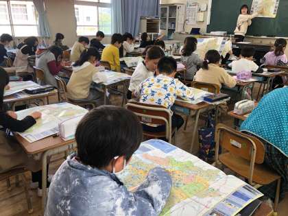 2年生までの生活科の学習では、学校たんけんや身近な学校のまわりの町の様子について学習しましたが、社会科では、大阪市や大阪府、日本全体や世界の国々と、学年があがるごとにどんどん広い世界を学んでいきます。