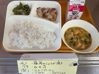 4月19日(水)、今日の給食は「豚肉のしょうが焼き・みそ汁・じゃこピーマン・ごはん・牛乳」です。