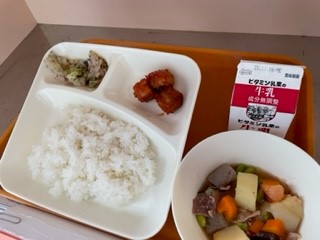 4月26日(水)、「まぐろのオーロラ煮・豚肉と野菜の煮もの・キャベツの赤じそあえ・ごはん・牛乳」です。