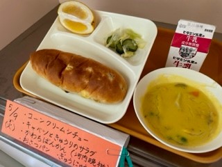 5月9日(火)、今日の給食は「コーンクリームシチュー・キャベツときゅうりのサラダ・かわちばんかん・おさつパン・牛乳」です。