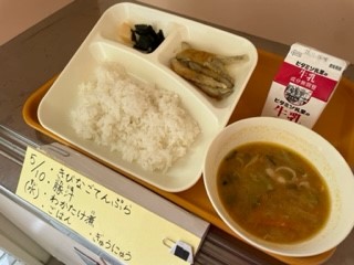 5月10日(水)、今日の給食は「きびなごてんぷら・豚汁・わかたけ煮・ごはん・牛乳」です。