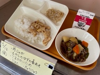5月12日(金)、今日の給食は「肉じゃが・もやしのゆずの香あえ・ごまかかいため・ごはん・牛乳」です。