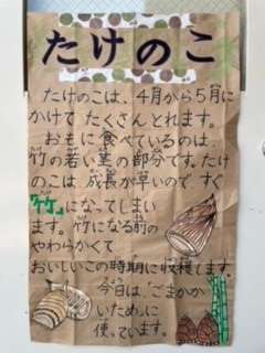 今日の「ごまかかいため」は、新物のたけのこを使ったソフトふりかけのような一品です。たんざく切りにしたたけのこを炒めて、みりん、こいくちしょうゆなどで味つけして炒りつけて、最後にかつおぶし、いりごまを加えてさらに炒めています。