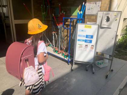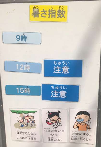 本校では、熱中症から子どもたちを守る取組の一つとして、朝の登校時から玄関付近に暑さ指数の掲示をしています。